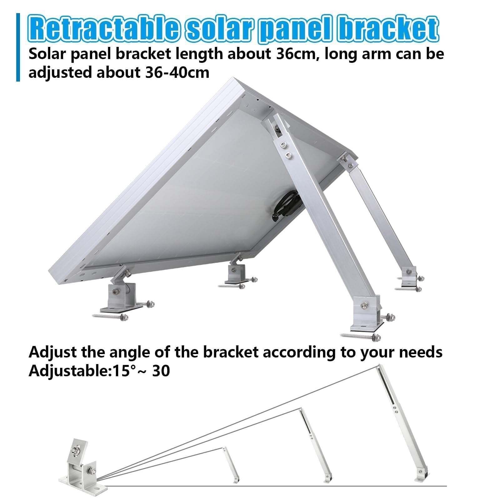 These adjustable solar panel tilt mount brackets help you mount solar panels on flat surfaces while allowing a 15°–30° tilt adjustment to improve sun exposure. The extendable arms (approx. 14–27 inches) support a wide range of panel sizes typically used in RV, roof, boat, and off-grid installations.